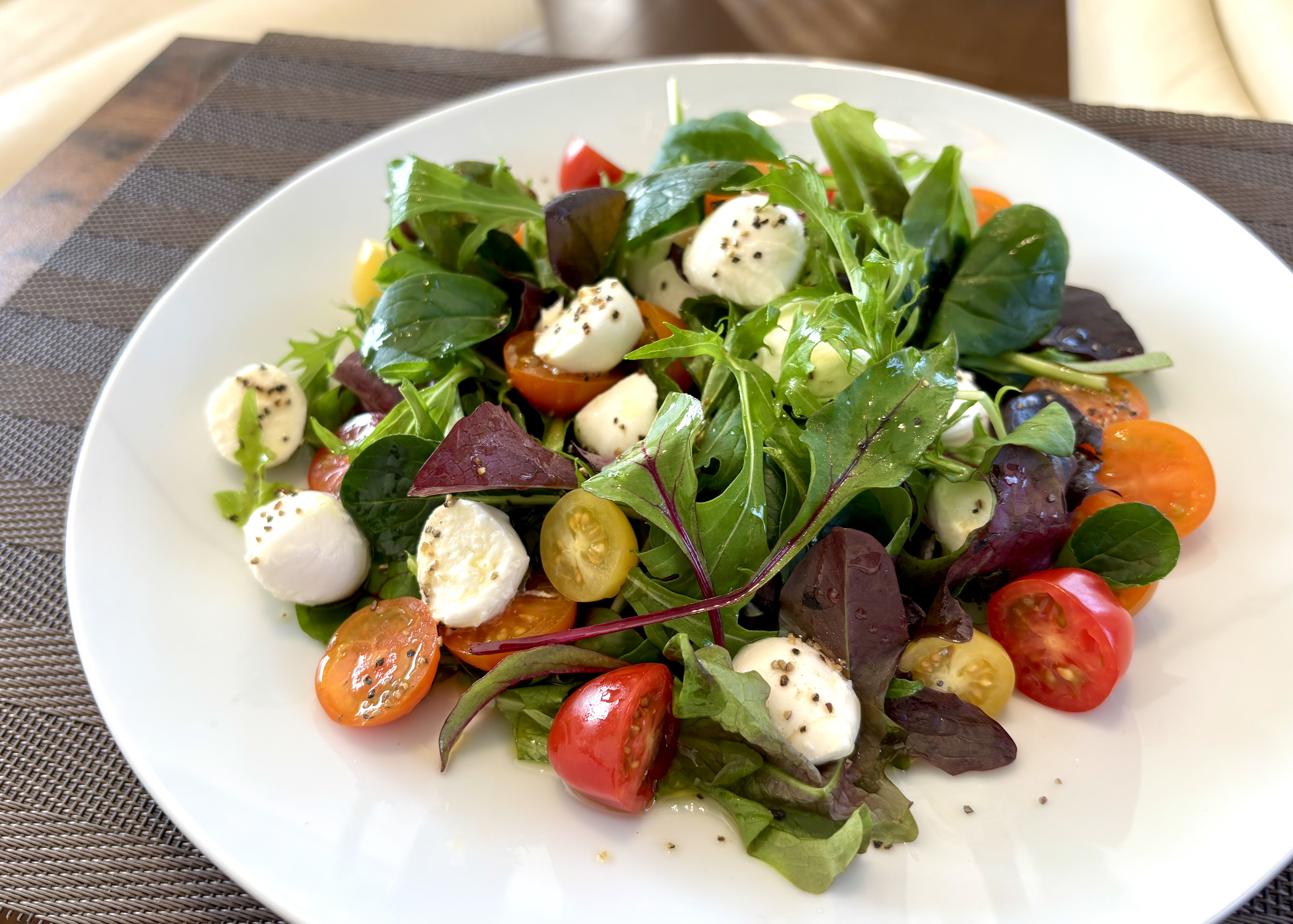果実堂のベビーリーフに、カラフルなミニトマトと、一口サイズのモッツァレラチーズを合わせました。味付けはシンプルに、オリーブオイルと塩、そして少しのブラックペッパーで。ぜひ、ご家庭の食卓で「彩り」と「鮮度」をお楽しみください!